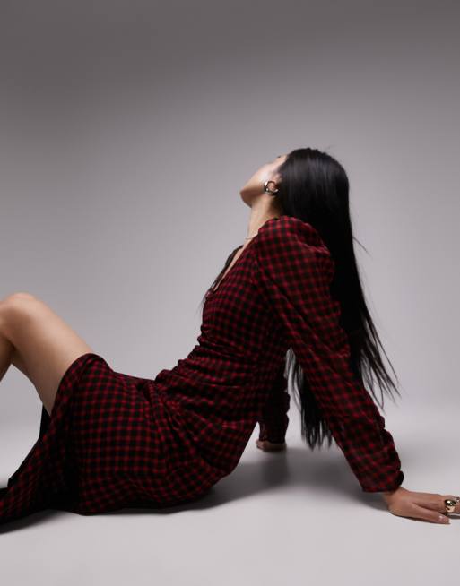 Topshop Robe mi longue fronc e devant carreaux vichy Rouge et noir