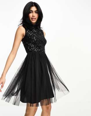 Maya Petite high neck mini tulle dress with tonal delicate sequins