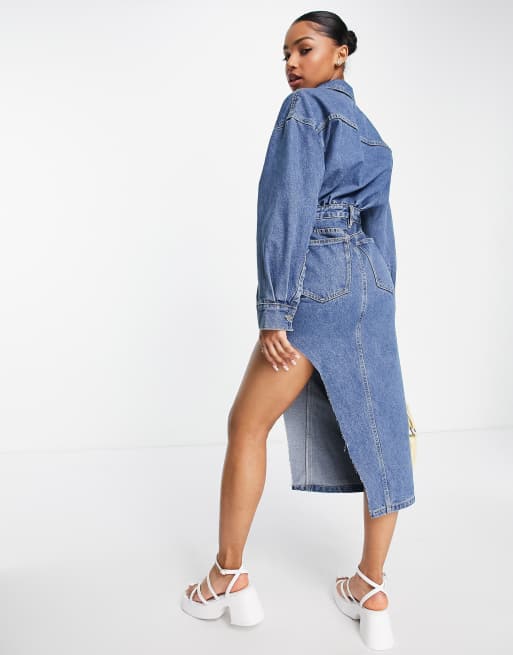 Alison Midi Dress Long Sleeve Front Split Denim Dress in Mid