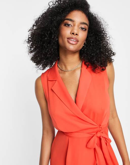 Robe outlet portefeuille orange, ASOS DESIGN Robe portefeuille mi longue sans manches avec col et lien nou sur le devant Orange outlet