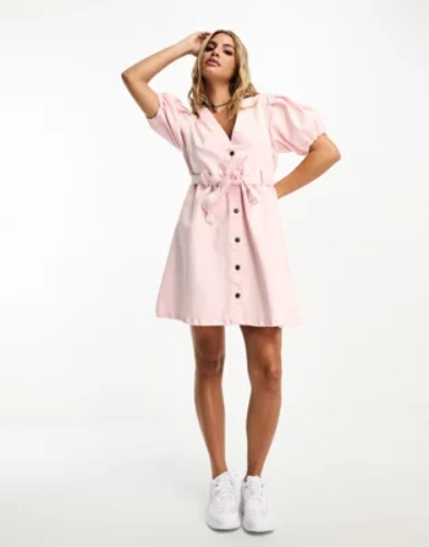 ASOS DESIGN denim belted shirt dress in white