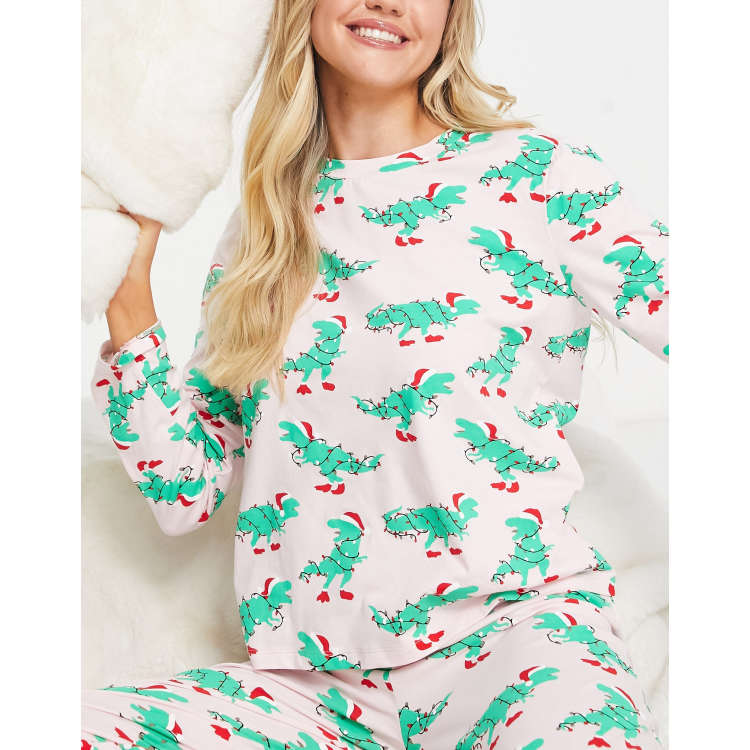 Pieces Christmas top legging pyjama set in green dinosaur print