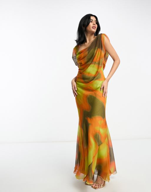 ASOS DESIGN Robe asym trique longue et drap e imprim abstrait flout Jaune