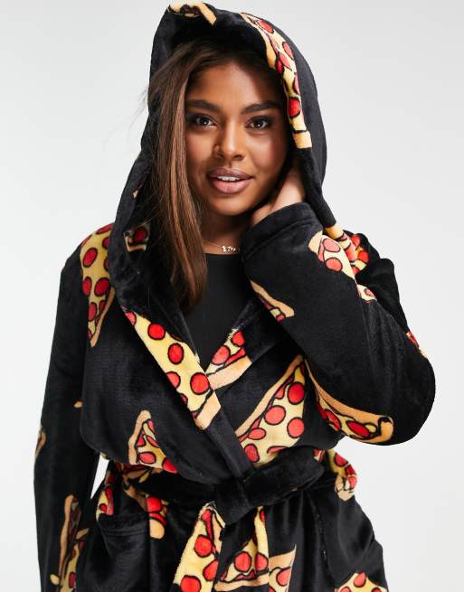 ASOS DESIGN Curve super soft pizza print fleece robe in black ASOS
