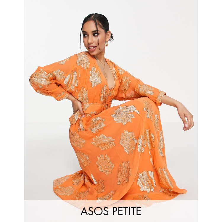 Robe outlet orange asos, ASOS DESIGN Petite belted batwing maxi tea dress in orange metallic jacquard outlet