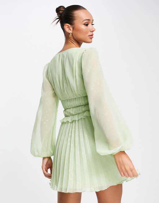 ASOS DESIGN Vestito corto a pieghe con bottoni e arricciato in vita in plumetis metallizzato verde tenue