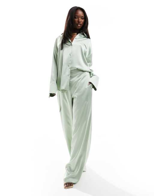 ASOS DESIGN satin pajama wide leg pants in sage green part of a