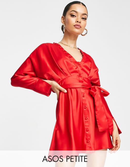 Robe boutonnée outlet devant asos, ASOS DESIGN Petite Robe courte boutonn e en satin avec manches chauve souris et liens nou s sur le devant Rouge outlet