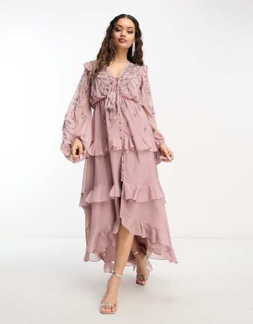 ASOS DESIGN Robe mi longue nou e sur le devant fermeture boutonn e et broderie florale Blush