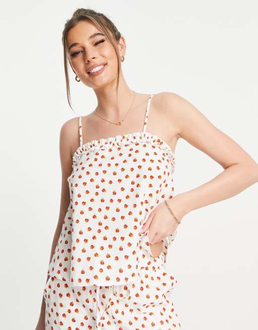 ASOS DESIGN mix match linen floral pajama cami with frill in cream red