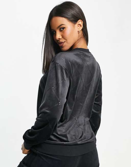 Adidas outlet velvet sweatshirt, adidas Originals velour sweatshirt with all over trefoil print in black outlet