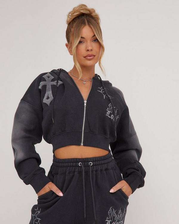 Zip Front Crucifix Detail Oversized Cropped Hoodie In Navy Ombre EGO