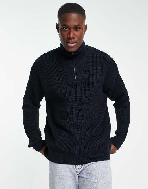 New Look fisherman ribbed 1 4 zip funnel neck sweater in navy