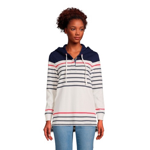 Lands End Women s Petite Long Sleeve Heavyweight Jersey Button Front Hoodie Tunic Small Ivory Navy Founder Stripe