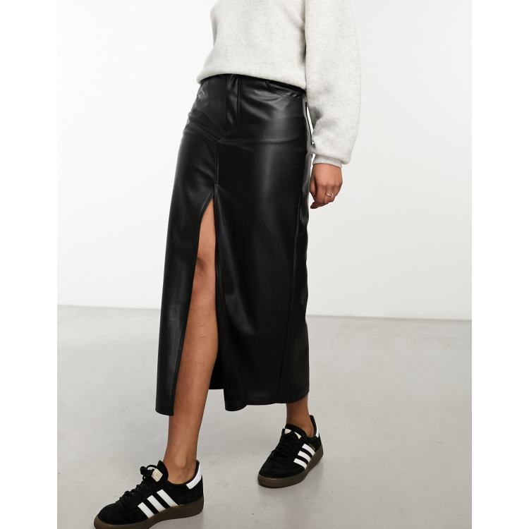 Pull Bear Jupe mi longue fendue devant imitation cuir Noir ASOS
