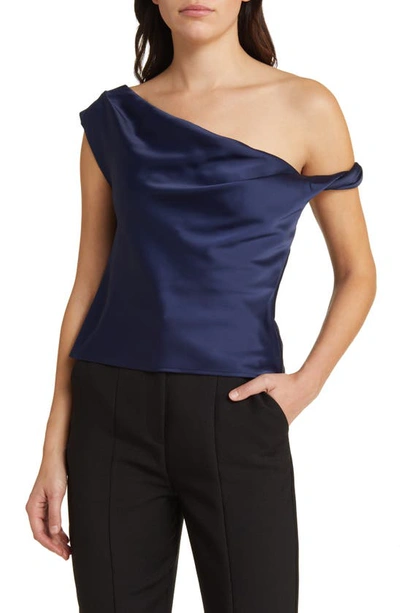 Wayf Twist One shoulder Satin Blouse In Navy ModeSens