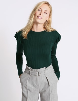 Ribbed Frill Shoulder Crew Neck Jumper M S Collection M S