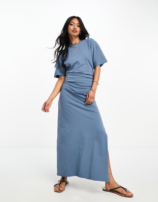 ASOS DESIGN Robe t shirt mi longue col ras du cou et fronces lat rales Bleu d lav