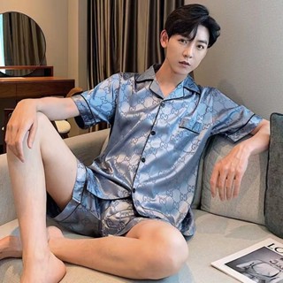 Men s Short Sleeve Silk Pajama Tops Shorts Sleep Set