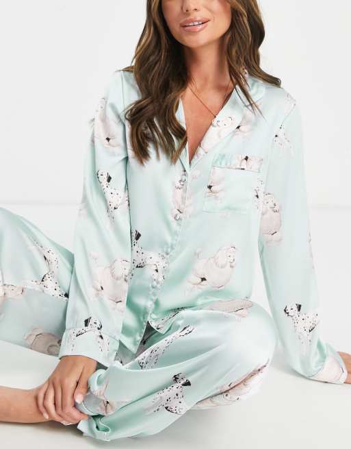 ASOS DESIGN satin dog print shirt trouser pyjama set in sage ASOS