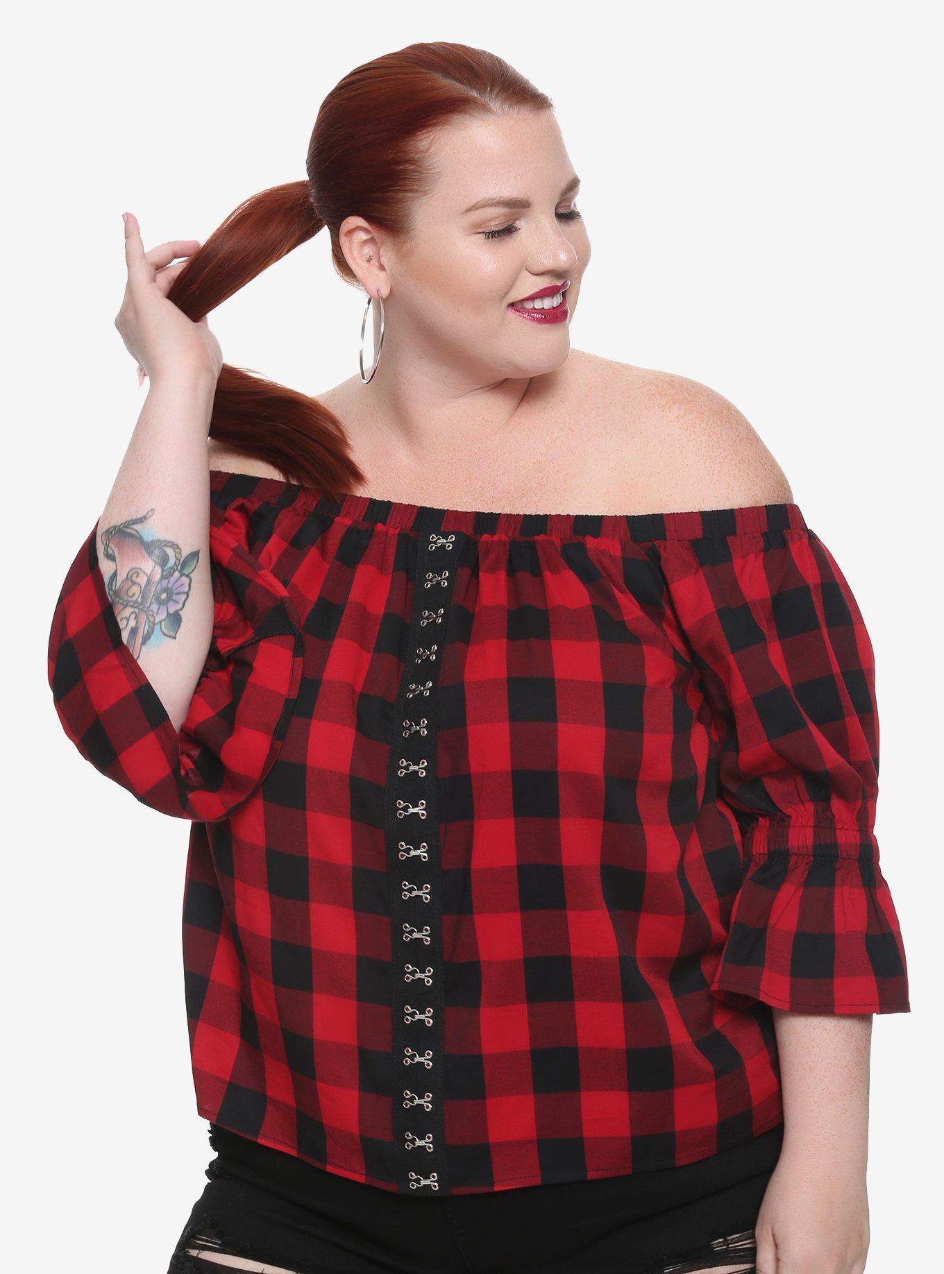 Red Black Buffalo Plaid Hook Eye Off The Shoulder Girls Top