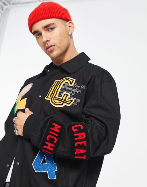 ASOS DESIGN oversized varsity jacket in black with badges ASOS
