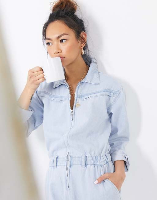 Pull Bear zip detail denim boilersuit in light blue