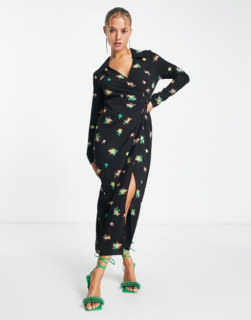 ASOS DESIGN Robe chemise mi longue cache c ur boutonn e fronc e sur le devant imprim fleurs Noir
