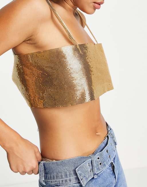 Femme Luxe Crop top bretelles effet cotte de maille Dor
