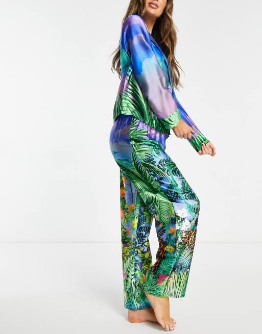 ASOS DESIGN Ensemble de pyjama de qualit sup rieure avec chemise crois e et pantalon en satin motif l opard v g tal Multicolore