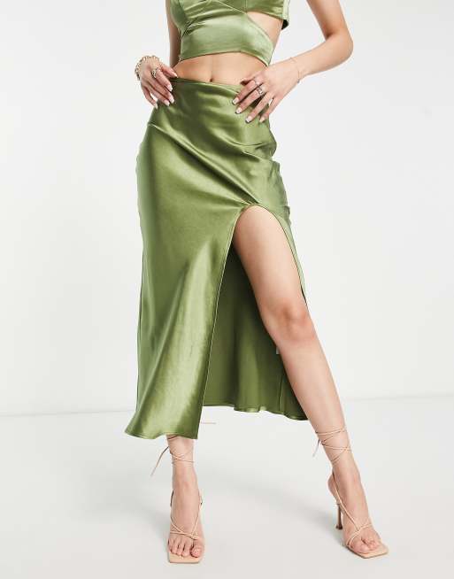 Jupe Fendue Longue Satin e Stretch Vert Olive PrettyLittleThing FR