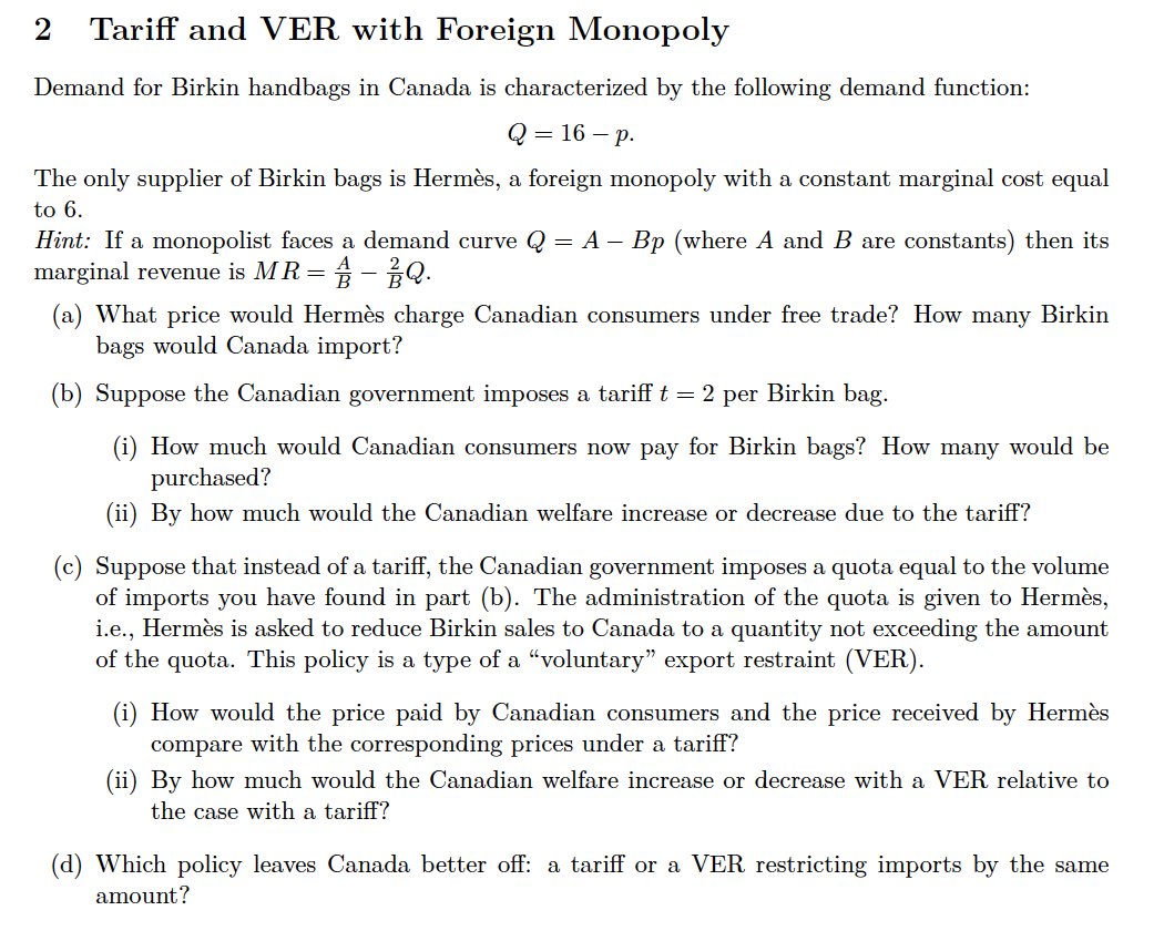 Solved 2 Tariff and VER with Foreign Monopoly Demand for Chegg
