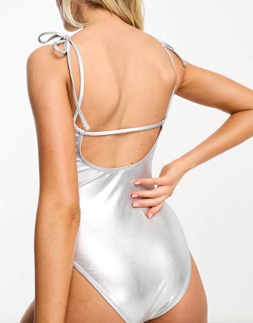 Stradivarius Maillot 1 pi ce col en V Argent m tallis