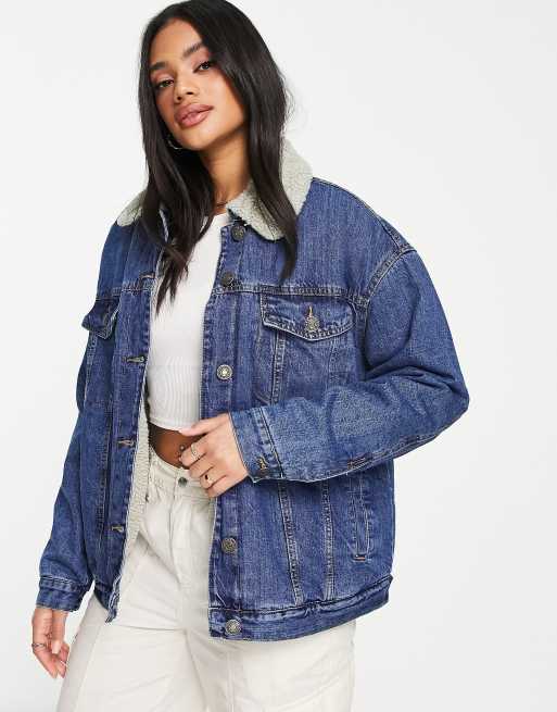 Buy Mid Blue Veste en jean avec doublure imitation peau de
