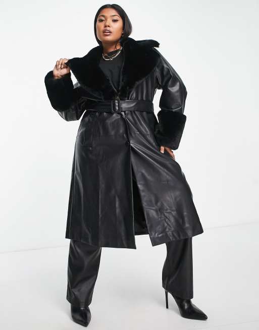 Forever New Curve Manteau ceinture en PU et fausse fourrure Noir