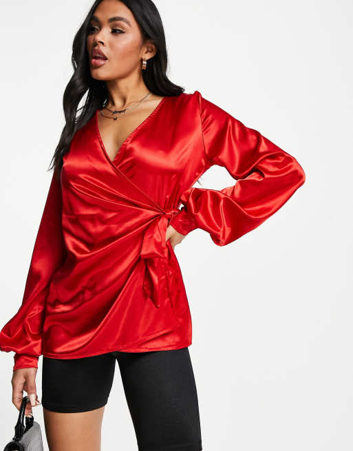 Femme Luxe drape wrap satin blouse in red