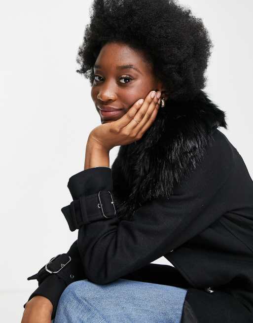 Morgan Manteau coupe princesse avec encolure en fausse fourrure et ceinture Noir