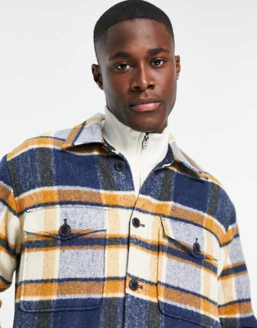 Selected Homme Blouson Harrington en laine carreaux Beige