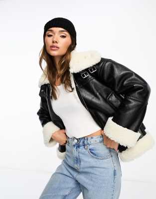 Blouson outlet aviateur stradivarius, Stradivarius Blouson aviateur crois avec imitation peau de mouton contrastante Noir outlet