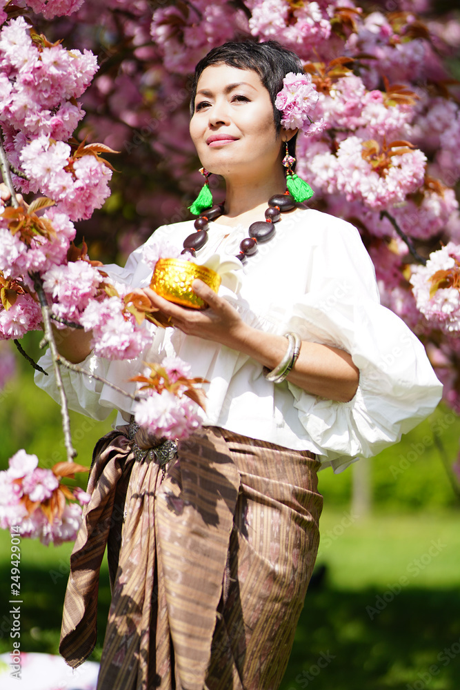 Femme en habit Tha landais cueillant des fleurs de Sakura au