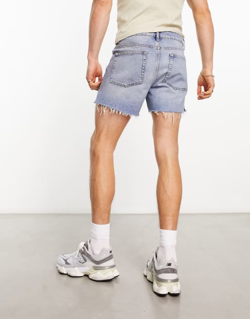 ASOS DESIGN shorter length denim shorts with rips in light wash