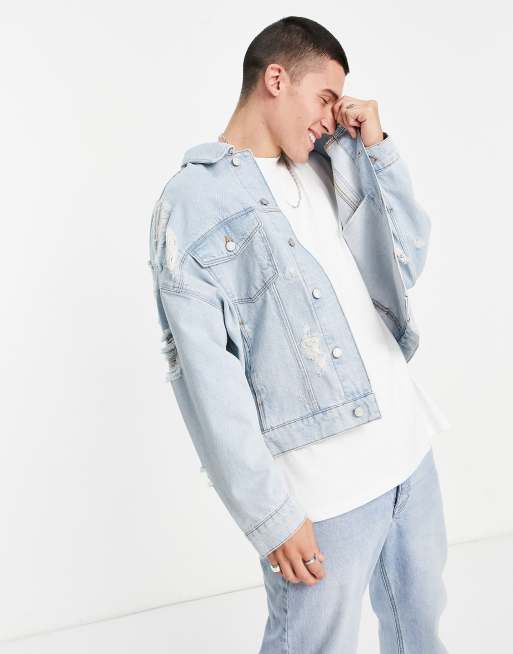Veste en outlet jean asos, ASOS DESIGN Veste en jean oversize d chirures Bleu d lav moyen outlet