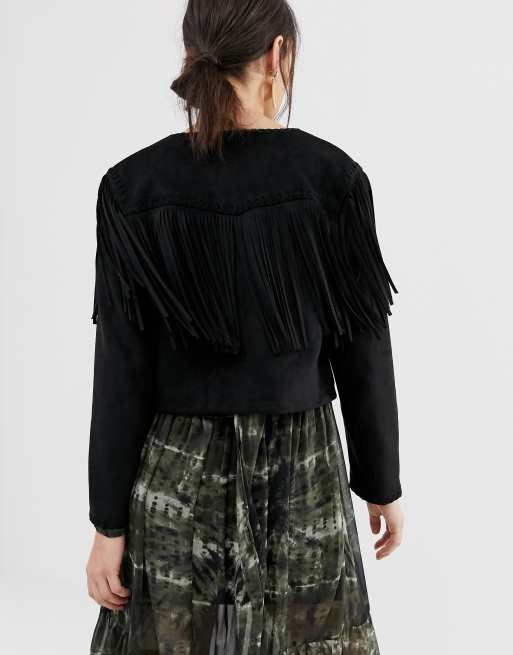 Veste outlet frange zara, Stradivarius cropped faux suede fringe jacket in black ASOS outlet