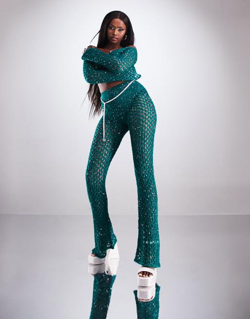 ASYOU Pantalon vas d ensemble en maille crochet e sequins