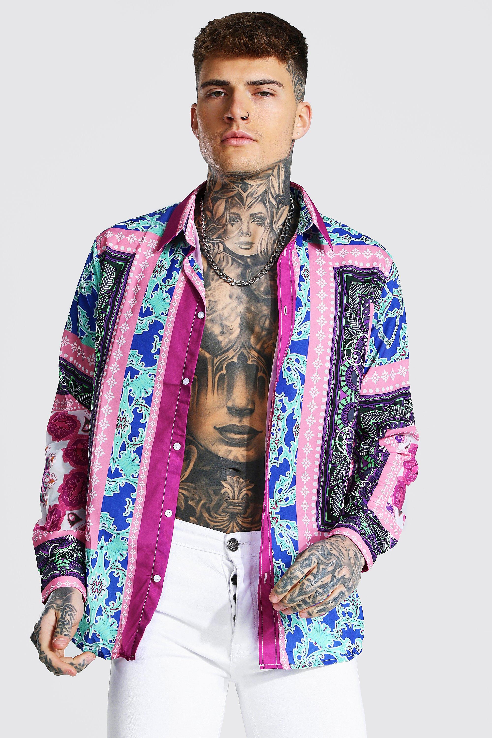 Long Sleeve Bright Baroque Print Shirt boohooMAN USA