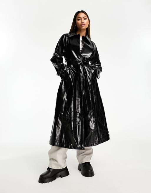 Trench vernis outlet noir femme, Jayley Trench coat oversize imitation cuir Noir verni outlet